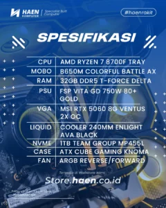Rp12.250.000Rakitan PC AMD Ryzen 7 8700F | RTX 5060 8G Ventus 2X OC | 1 TB Team Group MP44L Gen4x4